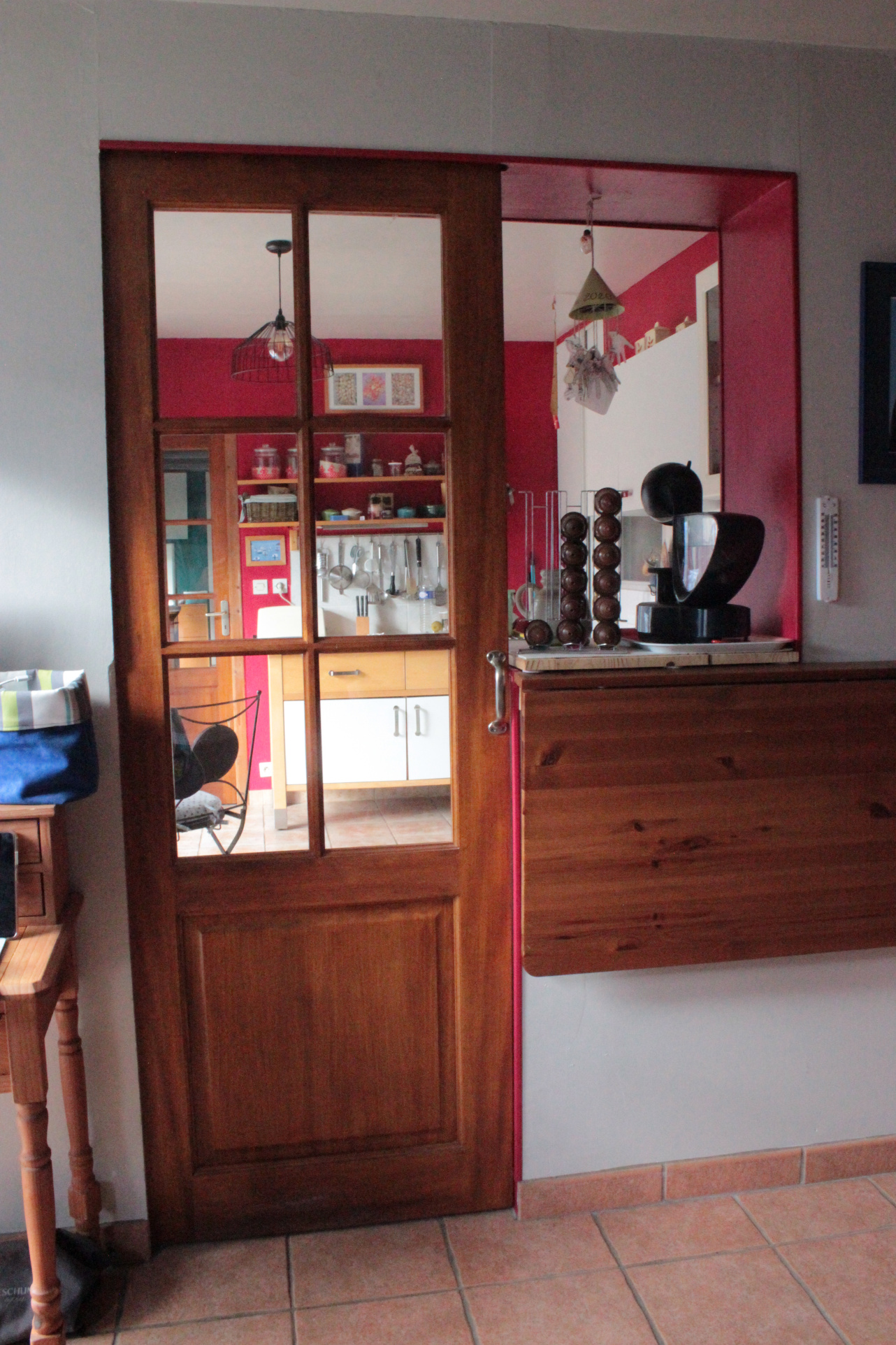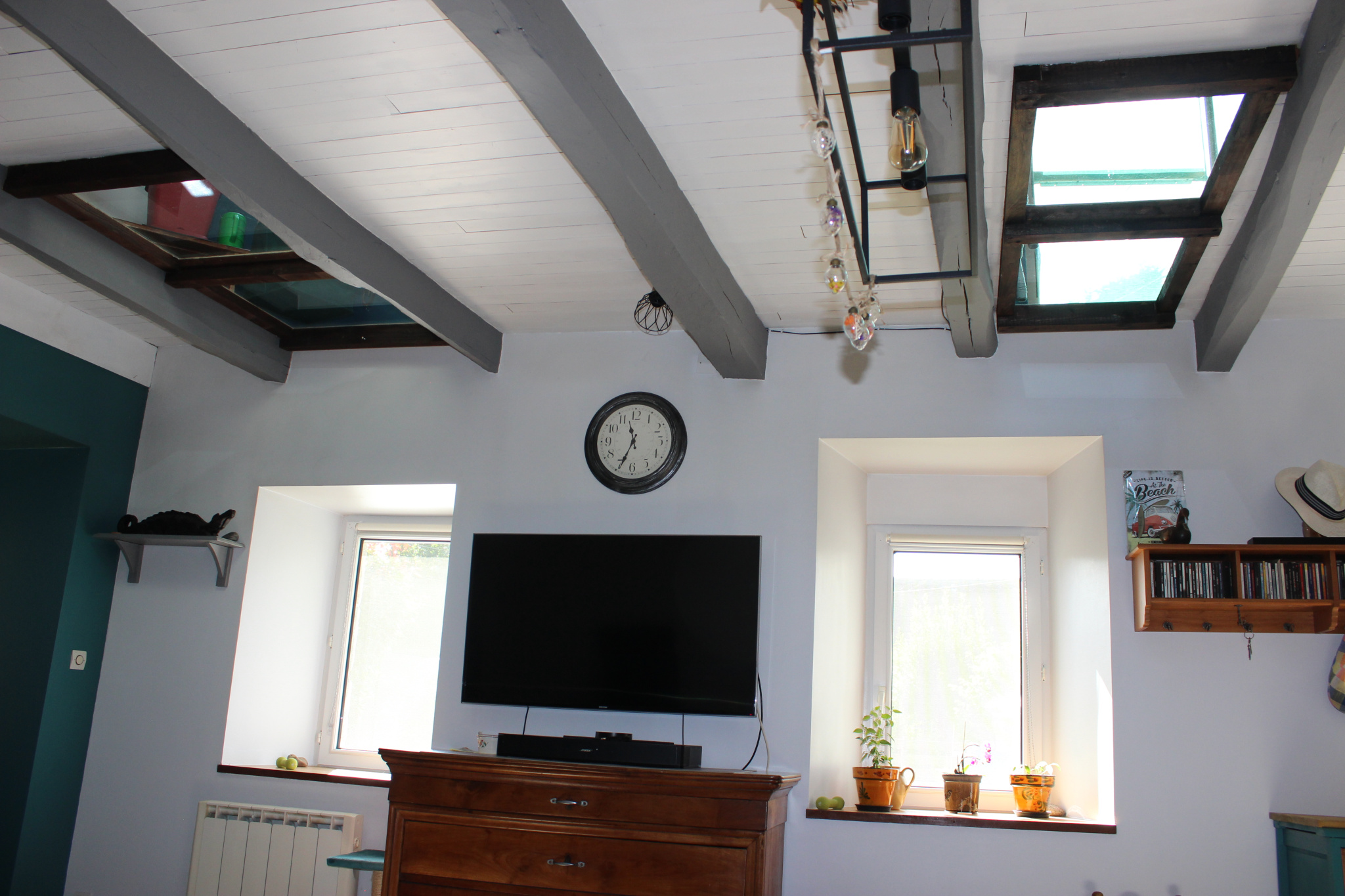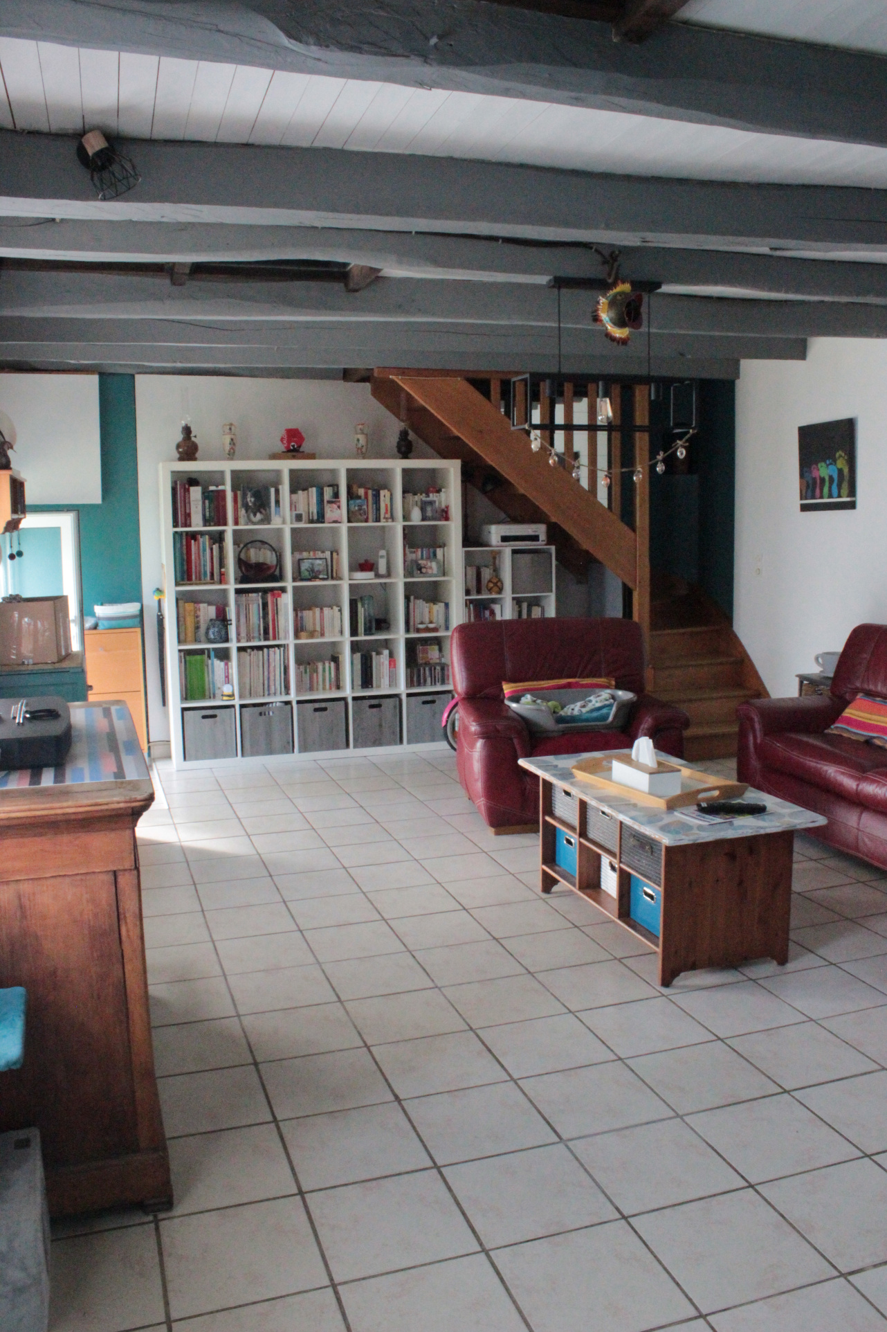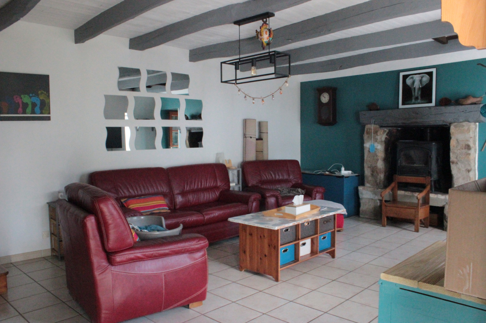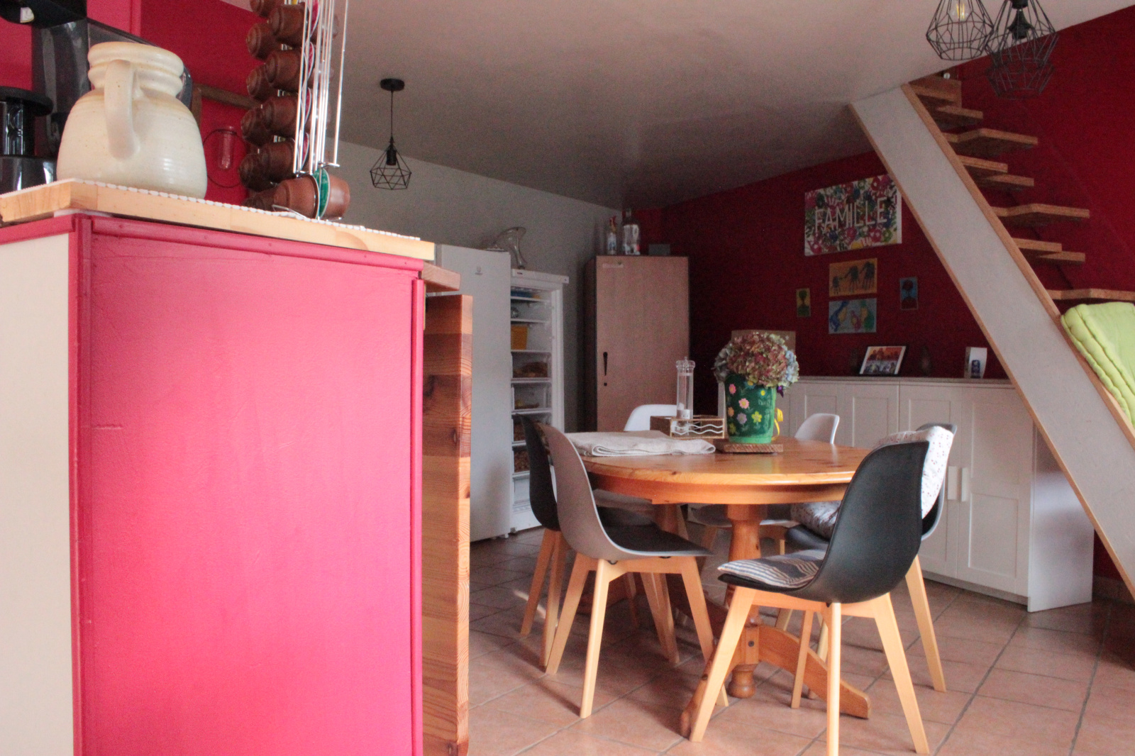 Très bel espace de vie avec poêl à bois, cuisine ouverte sur grande salle à manger;